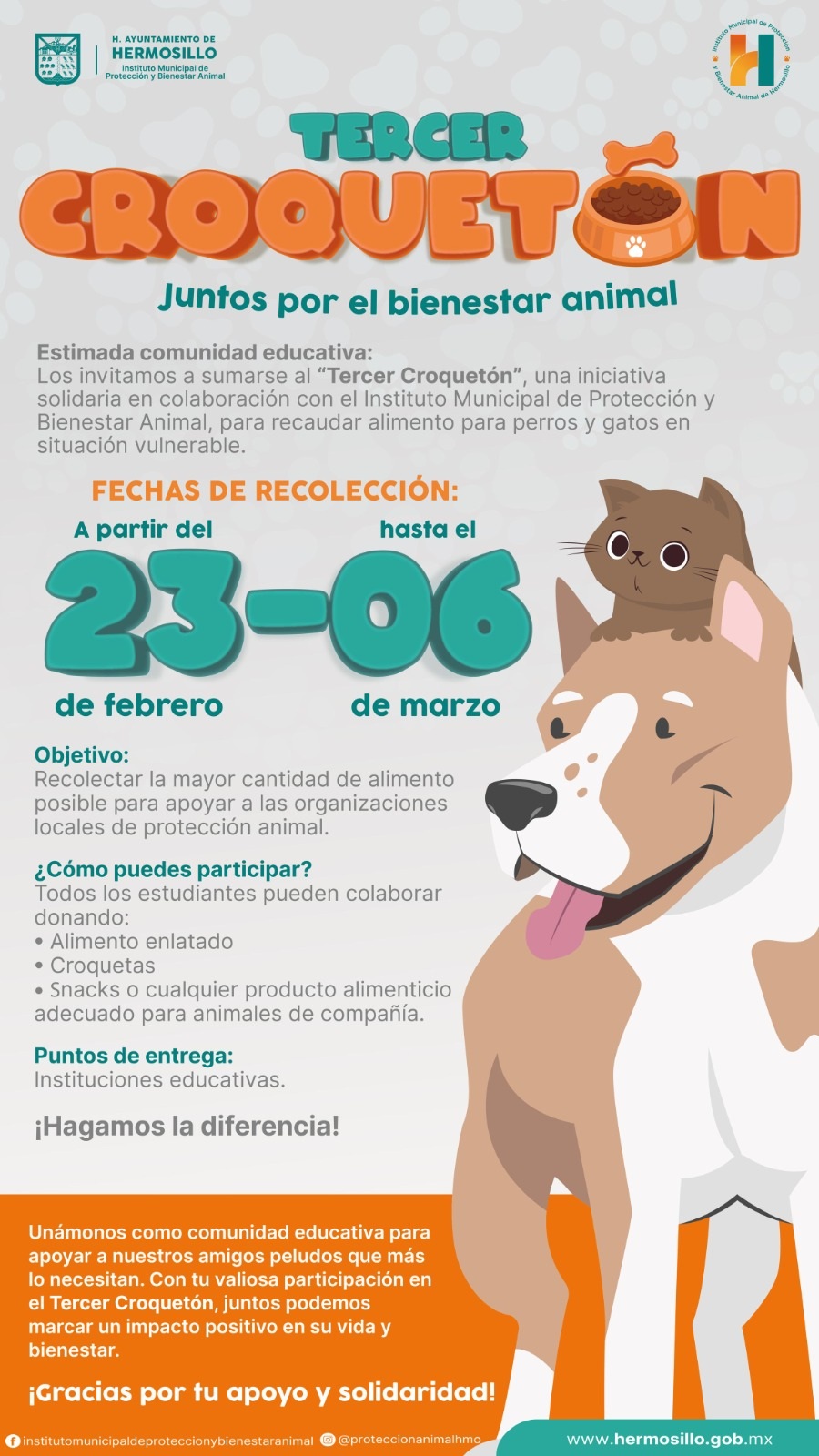 Precisó que la colecta es para educar, concientizar y sensibilizar a toda la comunidad educativa de instituciones desde educación básica hasta nivel superior, donde participan alumnos, docentes y padres de familia para lograr tener en Hermosillo una mejor cultura de tutela responsable de animales.
