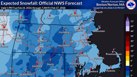 De acuerdo con el Servicio Meteorológico Nacional de Estados Unidos, se prevé un potencial de caída de nieve y aguanieve en los próximos tres días en Boston y Norton en Massachusetts.