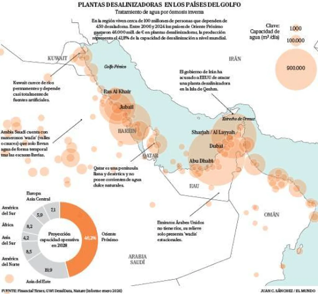 La expansión de la guerra entre Irán y Estados Unidos-Israel ha hecho florecer multitud de mapas del Golfo Pérsico, que revelan infraestructuras energéticas dañadas, bombardeos en bases estadounidenses y ataques en buques que intentan transitar el territorio. El tercer día de conflicto, Irán lanzó una de sus represalias, golpeando el puerto de Jebel Ali en Dubai y Kuwait. Los ataques, dirigidos contra la infraestructura energética de estos países, así como la intercepción de los misiles y drones, provocaron la caída de partes de los proyectiles a varios kilómetros, dañando plantas desalinizadoras de la zona. Este suceso puso en alerta a los expertos, que advirtieron sobre los peligros de que el Golfo Pérsico se convierta en una zona de combate justo donde se encuentran plantas de desalinización que abastecen a diario una región tan árida, castigada por la sequía y los efectos del cambio climático.