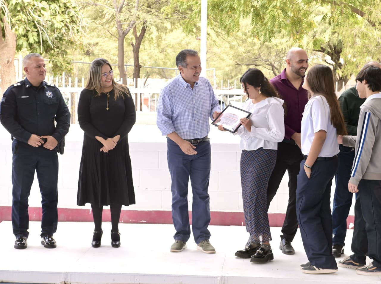 Los recibieron Jorge Luis González Fimbres y Cora Patricia Mora, director y directora de la escuela respectivamente y Fausto Blanco Dávalos supervisor de zona escolar y como invitadas acudieron las regidoras Dulce Robles y Carla Salcido.