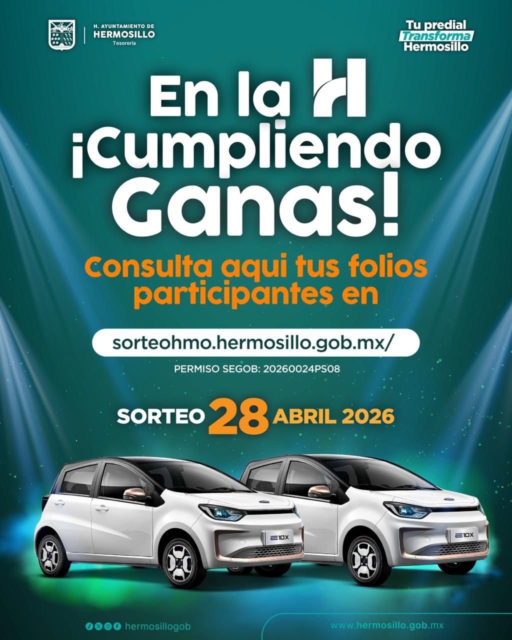 Recordó a las y los contribuyentes que pagaron a tiempo el predial 2026 de enero a marzo que pueden consultar los folios con los que participarán ingresando al sitio web oficial del Gobierno de Hermosillo: www.hermosillo.gob.mx y dar click en el banner de consulta.